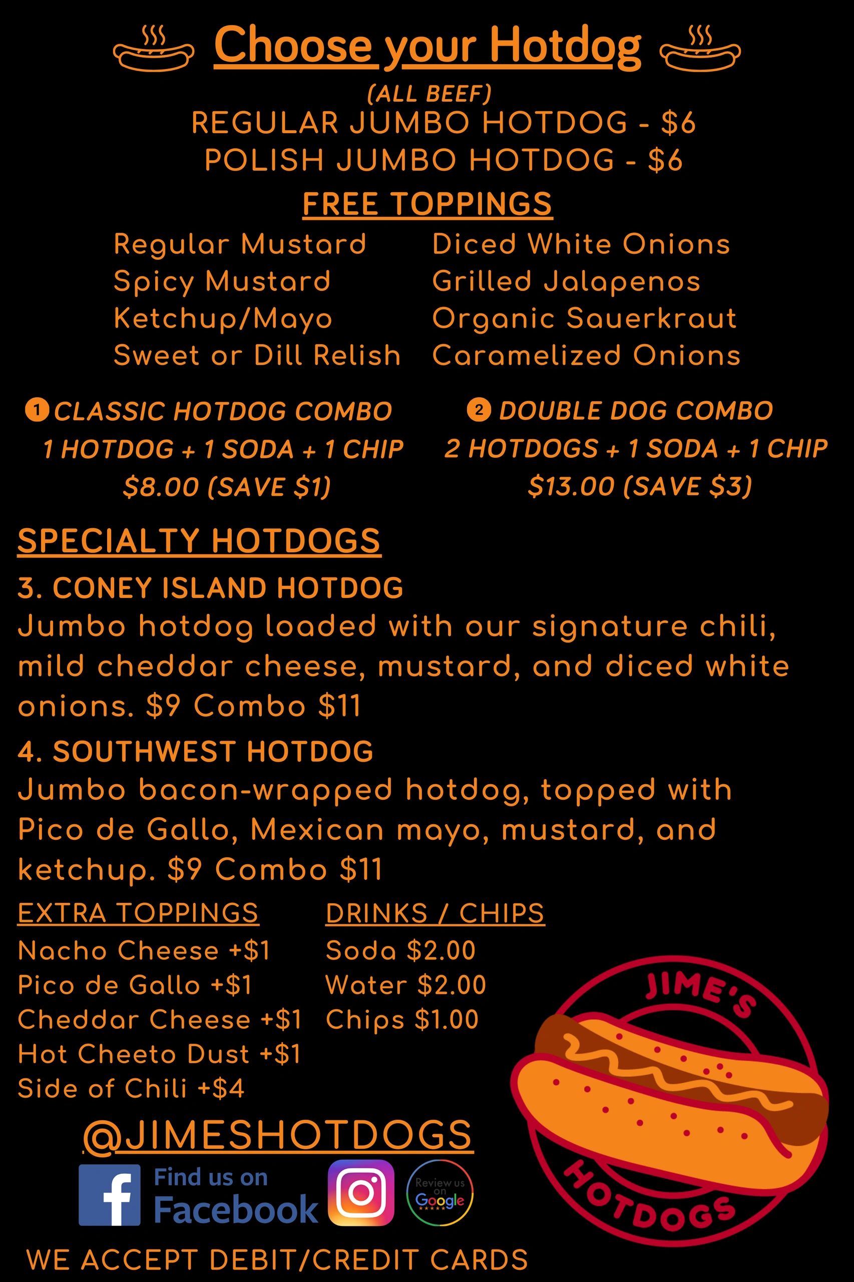 Follow us on social media @JimesHotdogs to stay updated on our latest events and locations! Interested in catering? Fill out our request form—we’d love to serve your next event. Need to get in touch? You’ll find all our contact info at the bottom of the page.
